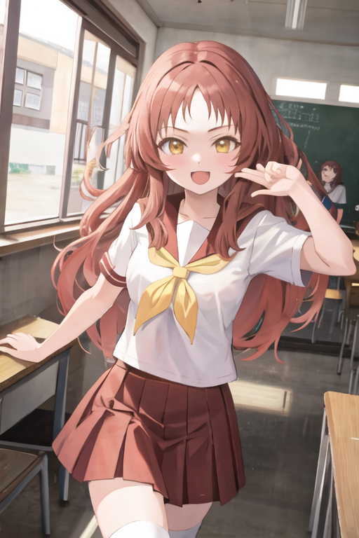 Use sailor collar, serafuku, yellow neckerchief, white shirt, red skirt, school uniform to summon her school uniform