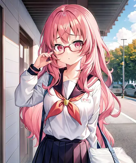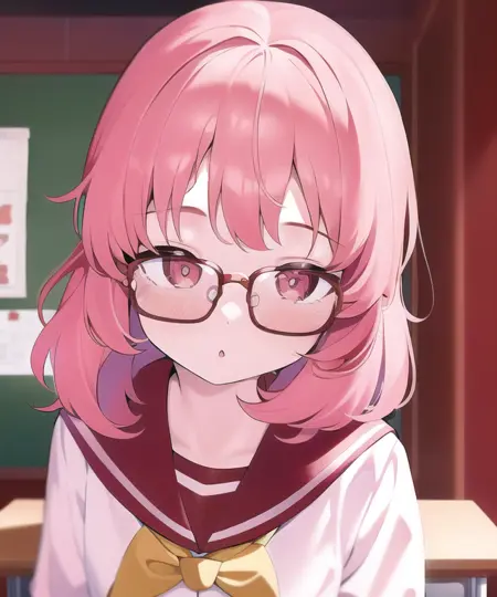 _au_mie, 분홍 머리, 중간 길이 머리_로 그녀를 소환하고, _glasses_로 안경을 소환하세요. 안경을 제거하려면 _glasses_를 음의 프롬프트에 추가하세요. _sailor color, serafuku, school uniform_을 사용해 복장을 소환하세요. _squinting_을 사용해 만화처럼 눈을 squint하게 만드세요.