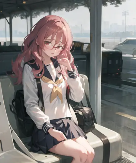 uses ai_mie, pink hair, medium hair to summon her, uses glasses to summon her glasses. put glasses to negative prompt to remove her glasses, Add sailor color, serafuku, school uniform, to summon her outfit, use squinting to squint her eyes, like in the manga.