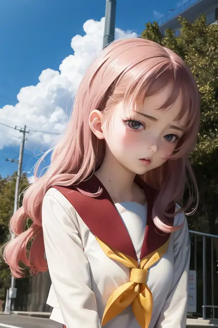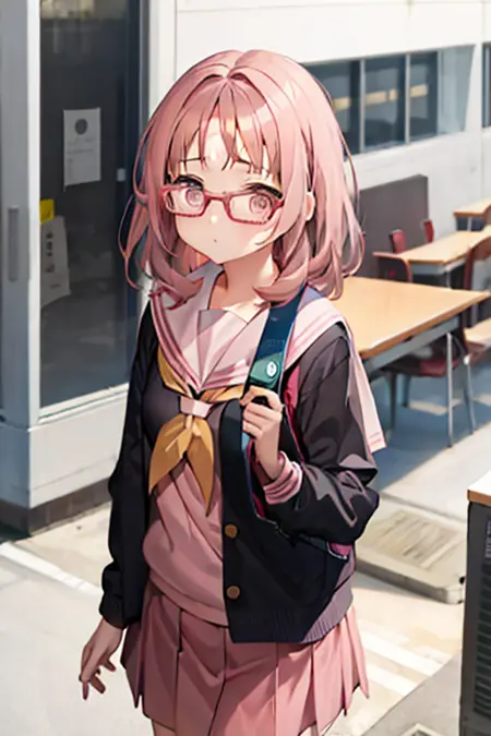 使用 ai_mie, 粉发, 中长发 召唤她,使用 眼镜 召唤她的眼镜。将 眼镜 加入负面提示可移除她的眼镜。添加 水手服色, 早礼服, 校服 召唤她的服装,使用 眯眼 让她眯起眼睛,如漫画中所示。