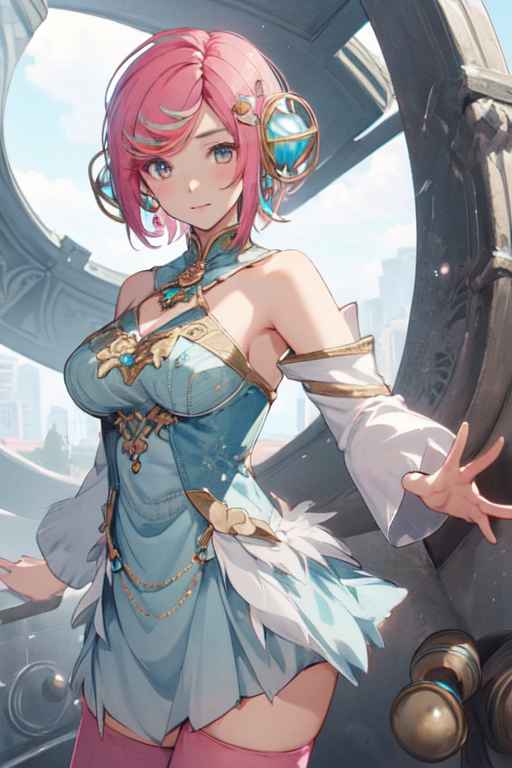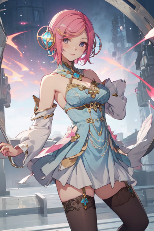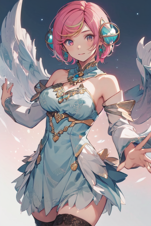 GaiaWO, 1girl, solo, short hair, hair ornament, blue dress, bare shoulders, jewelry, medium breasts, pink hair, detached sleeves, thighhighs,
