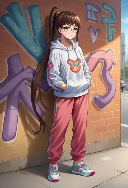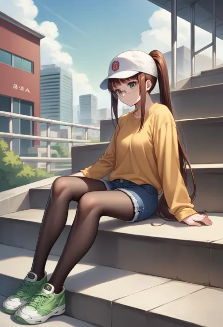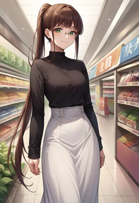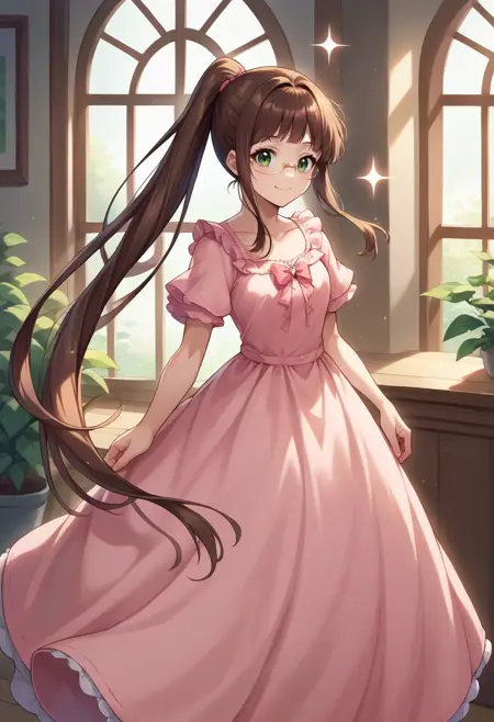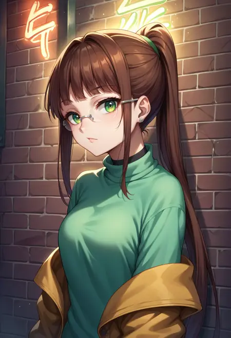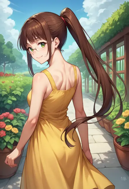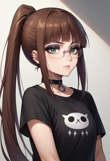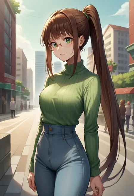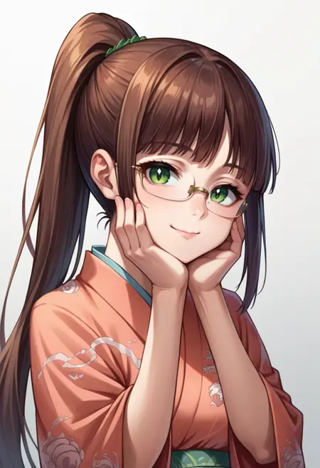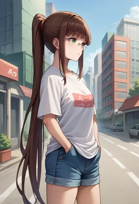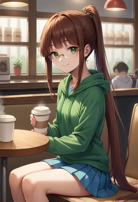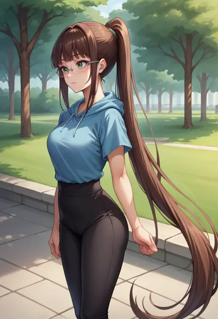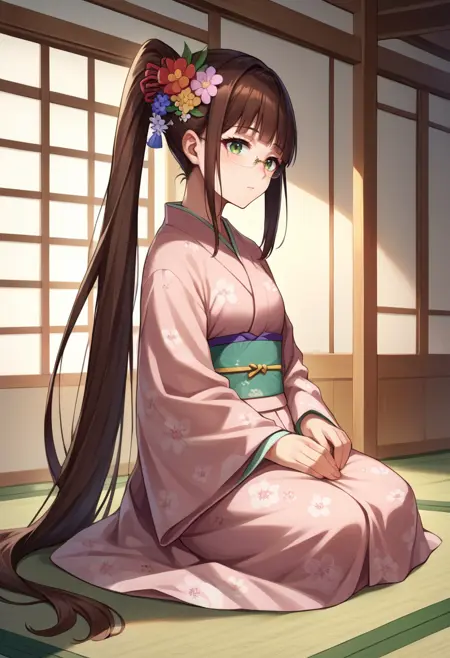 RuriMiyamoto, brown hair, bangs, very long hair, ponytail, green eyes, glasses