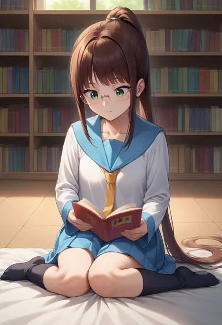 RuriMiyamoto, brown hair, bangs, very long hair, ponytail, green eyes, glasses, serafuku, long sleeves, blue sailor collar, yellow necktie, blue skirt, kneehighs, black socks