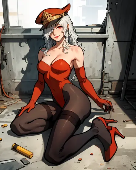 Trigger: N0r4SoR4, 1girl, long hair, white hair, hair over one eye, red lipstick, red leotard, bare shoulders, elbow gloves, highleg, hat, pantyhose, thigh boots, heels