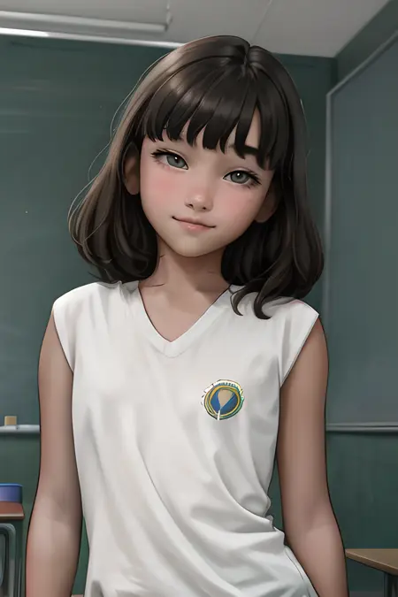 Prompts: beige shirt, bare arms, logo on shirt, green shorts