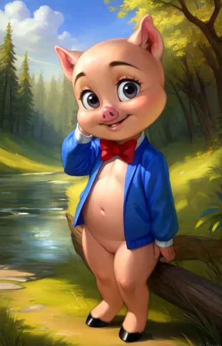 PorkyPigLooneyTunes, blue jacket, red bow tie, hooves,