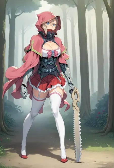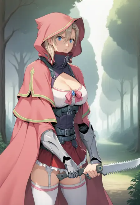 Notable tags: blonde hair, blue eyes, high collar, cloak, hood up, capelet, frilled skirt, belt, high heels, white thighhighs, garter belt, garter steaps, cleavage, claws, gauntlets,