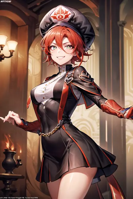 Recommended tags: Flamberge, 1girl, short hair, hat, dress, red hair, black headwear,hair between eyes,heart,