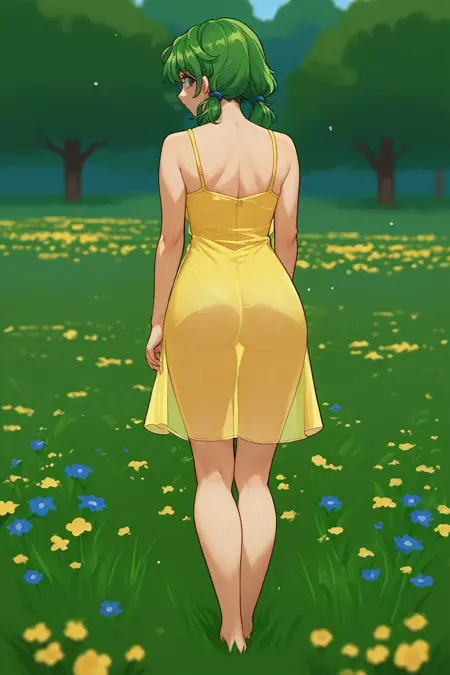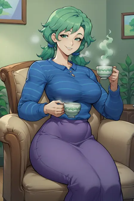 Caroline from Stardew Valley, the best waifu, even if you can't save her from vile claws of Pierre in the unmodded game. The sweet and friendly, tea-loving green-head FTW. LoRA is ok, the problems you might run into is - it might be stubborn and sometimes generate only 1 of her ponytail then using "from behind".
