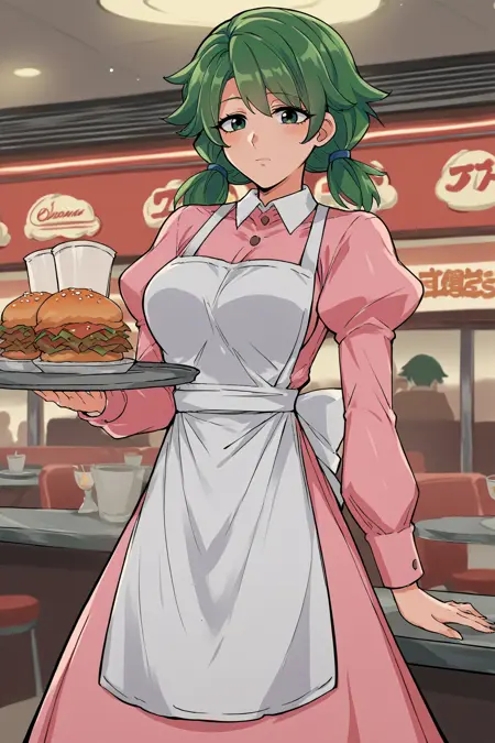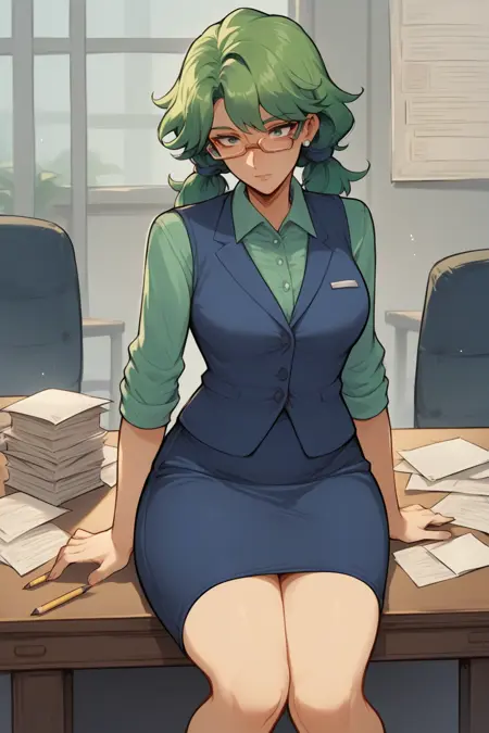 Helping Prompts: "green hair, low twintails, mature" (without mature, she looks too young for my liking)