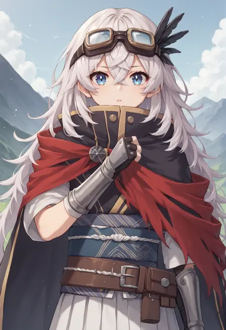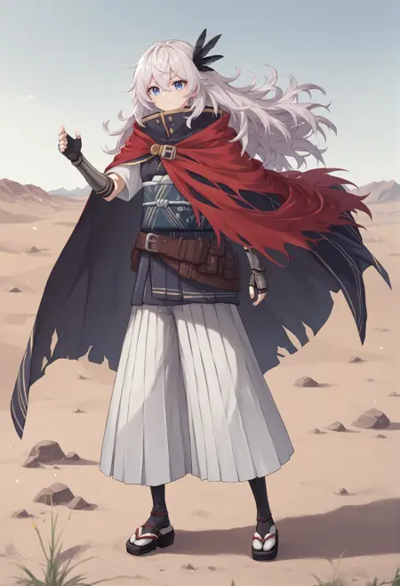 Costume 1: japanese clothes, white short sleeves, obi, belt, hakama, gauntlets, fingerless gloves, cape, cloak, goggles on head,
