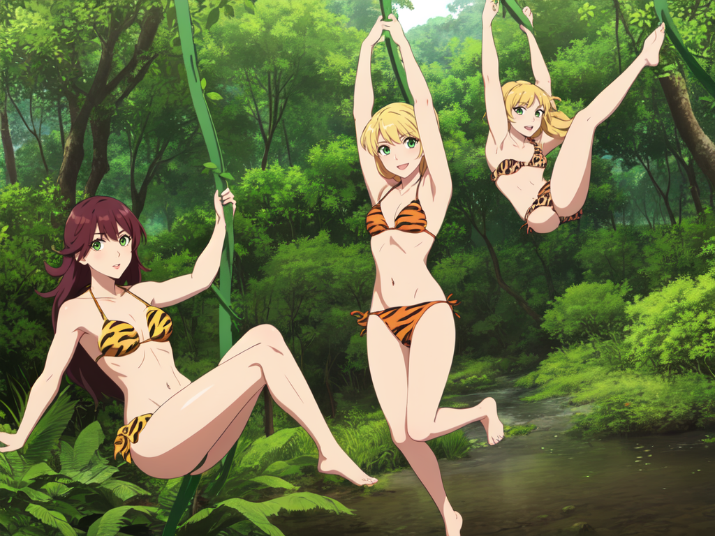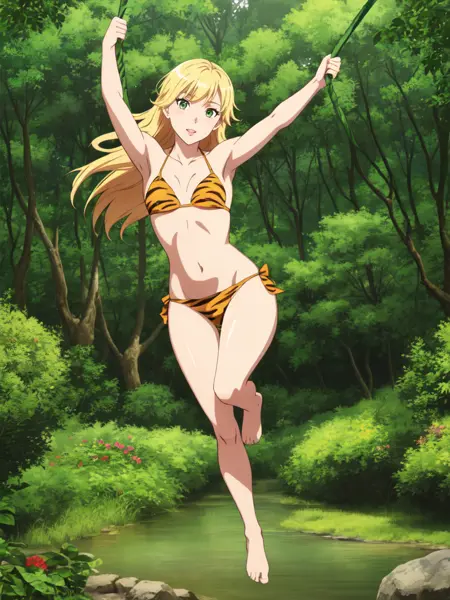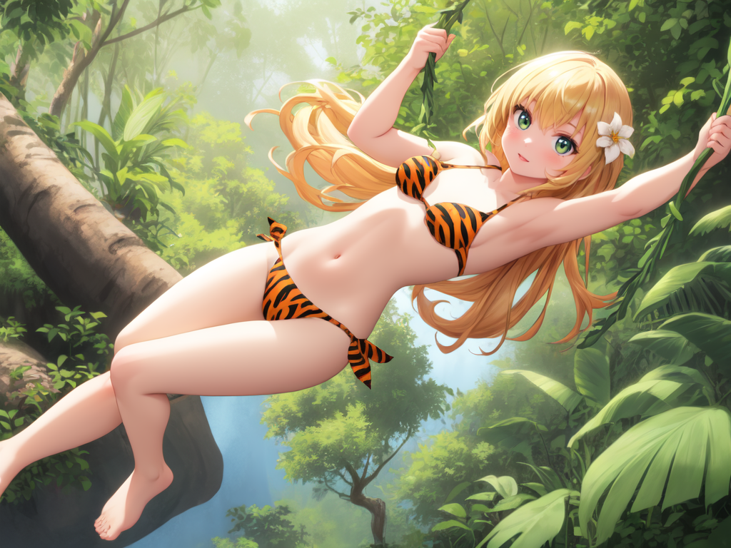 full body,Jungle,Jungle Background,cinematic shot,cowboy shot,(((Flying in midair))),(((Flying in the sky))),(((Flying Really high))),(((Holding Vine))),Holding SIngle Vine,Vine Swing,Vine Swinging,(((Vine Swinging Through The Jungle))),(((Off The Ground))),plant,nature,forest,vines,outdoors,leaf,holding,flower,feet,looking at viewer,feet,toes,swinging,grass,bare legs,hanging,arm up,swing,jumping,arms up,riding,legs,armpits,looking up,outstretched arms,freediving,diving,lying,on stomach,hands up,1girl,solo,long hair,looking at viewer,blonde hair,navel,green eyes,swimsuit,bikini,outdoors,flat chest,animal print,nature,forest,yellow bikini,tiger print,print bikini