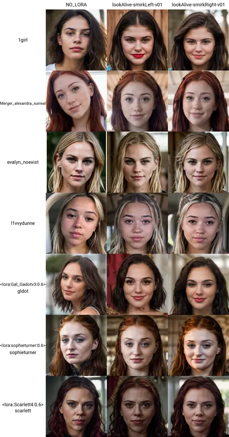 Look alive! is my series of facial expression LoRAs that are intended to work together with consistent character LoRAs and embeddings. This particular LoRA is for the smirking facial expression. Smirking is an asymmetric smile which can convey a range of nuanced emotions: a smirk can be smug, it can be mischievous, or it can even be flirtatious. It's more than just the mouth; the whole face, and especially the eyes, need to work together to form the expression.