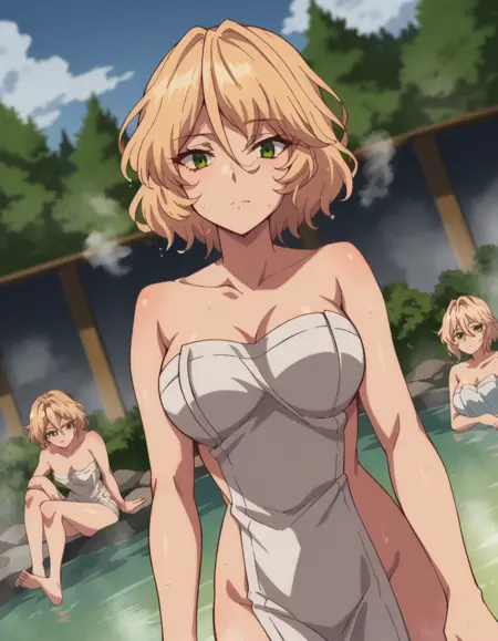 blade, blonde hair, green eyes, short hair, hair between eyes,