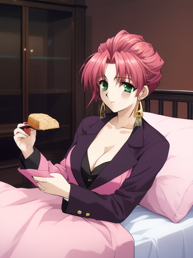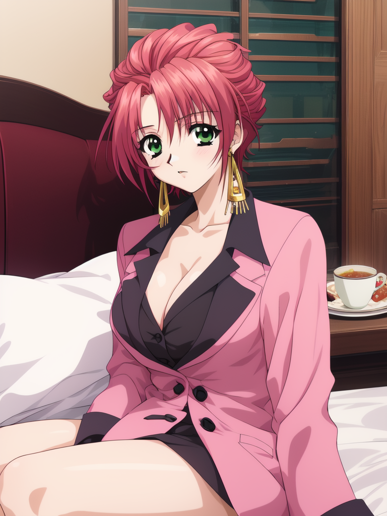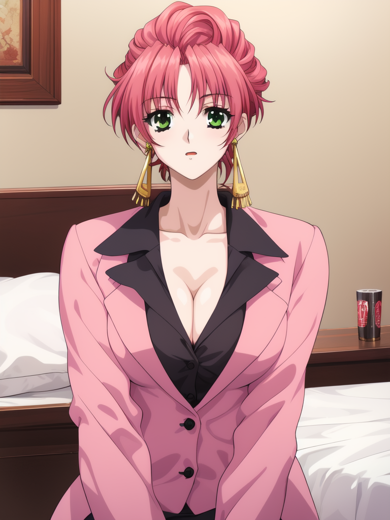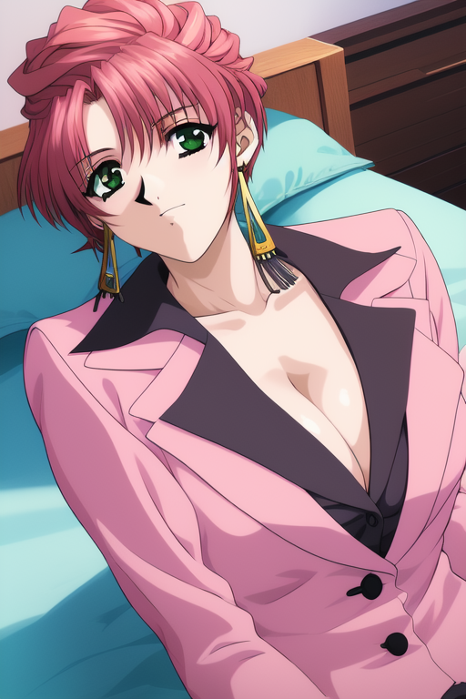 Houjou_Marina(ADAM_TDF), 1girl, solo, 귀걸이, 녹색 눈, 빨간 머리, 분홍색 머리, 단발, 큰 가슴,