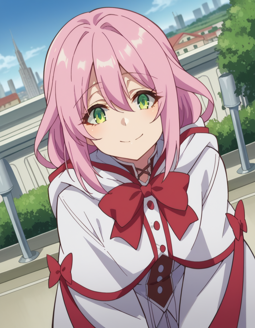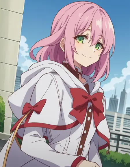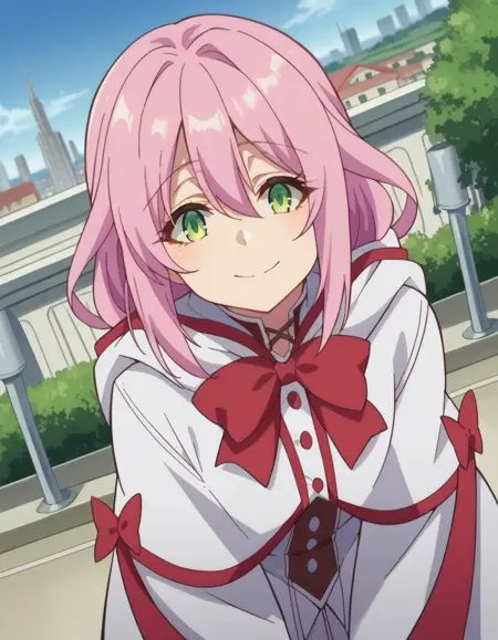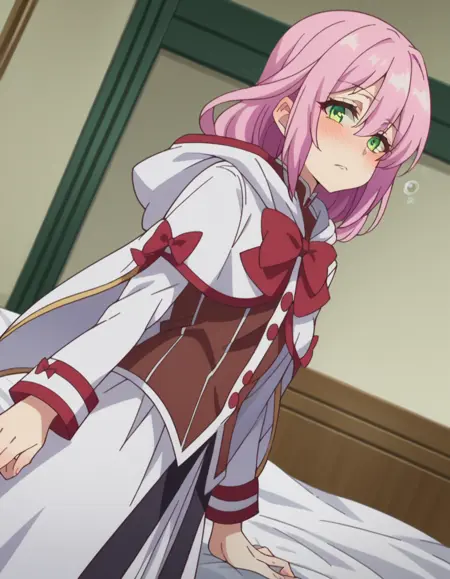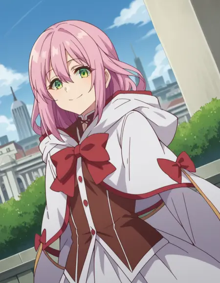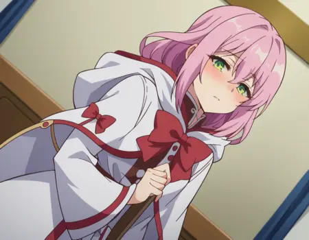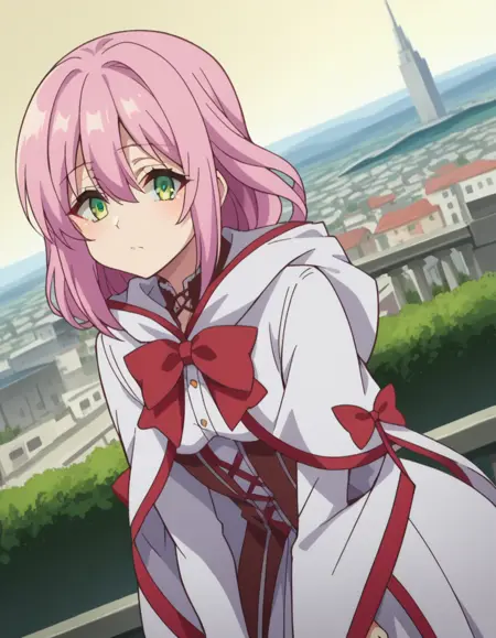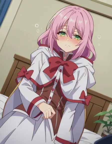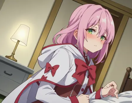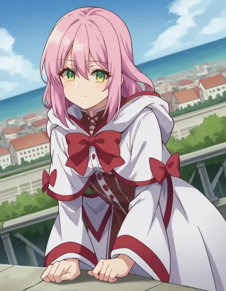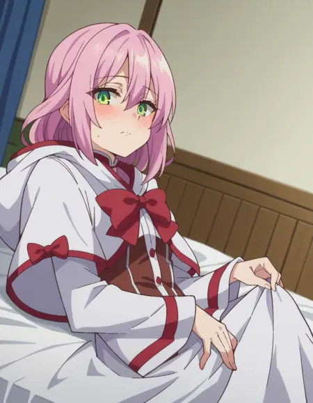 long sleeves, dress, bow, red bow, hood, robe, white robe,