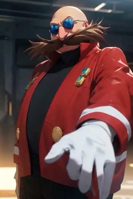 Prompt as usual is "Eggman, bald, brown moustache, blue tinted eyewear, pointy nose, red coat, black pants"