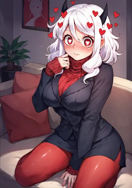 1girl, modeus (helltaker), 心形瞳孔, 心形, 角, 红色眼睛, 白发, 侧发, 红色毛衣, 黑色夹克, 黑色短裙,