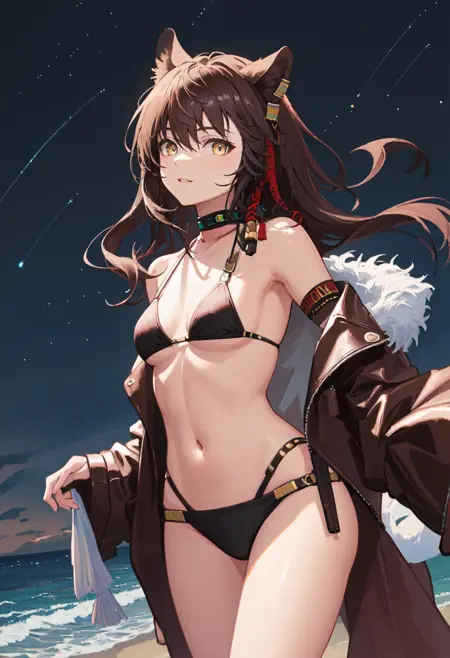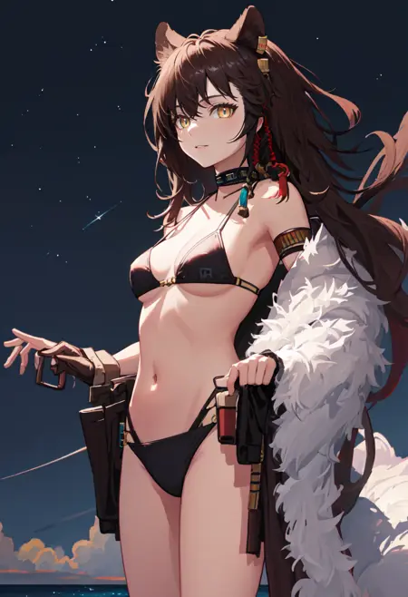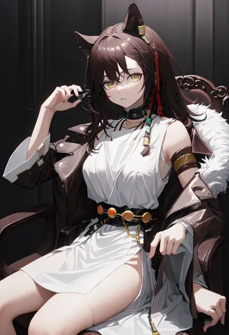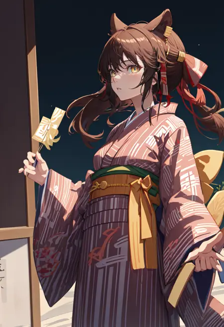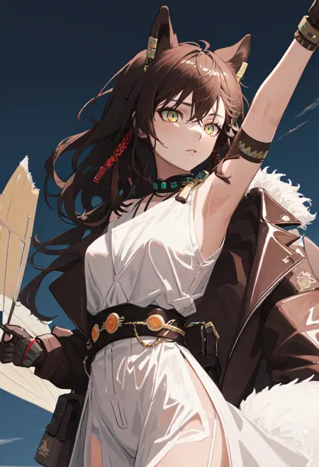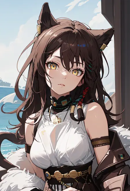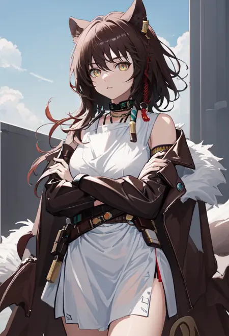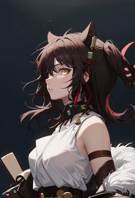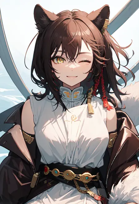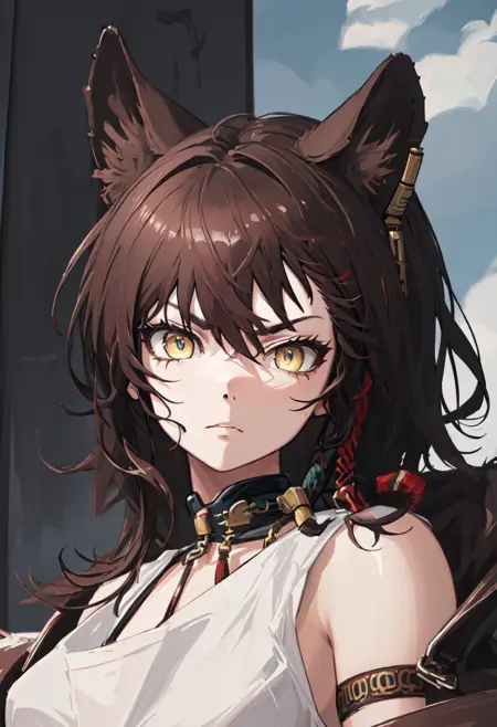 - The pruned character tags are animal ears, yellow eyes, brown hair, wolf ears, long hair, wolf girl, breasts, tail, hair between eyes, wolf tail. You can add them into prompts when core features (e.g. hair color) of character is not so stable.