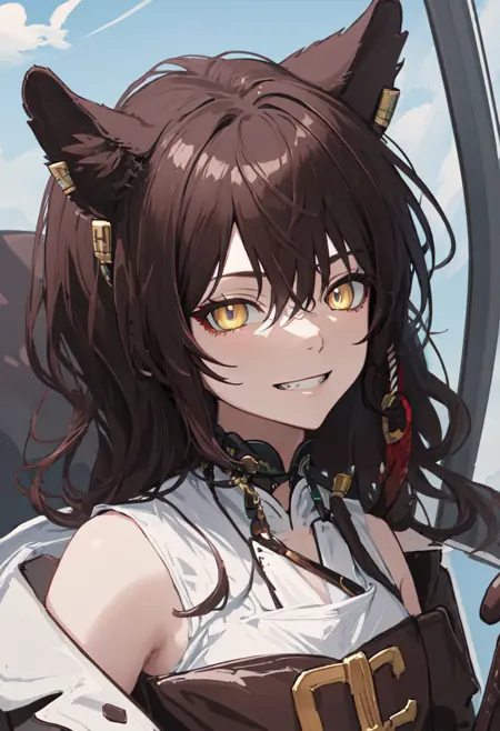 The trigger word is lunacub_arknights, and the pruned tags are animal_ears, yellow_eyes, brown_hair, wolf_ears, long_hair, wolf_girl, breasts, tail, hair_between_eyes, wolf_tail. When some features (e.g. hair color) are not so stable at some times, you can add these them into your prompt.
