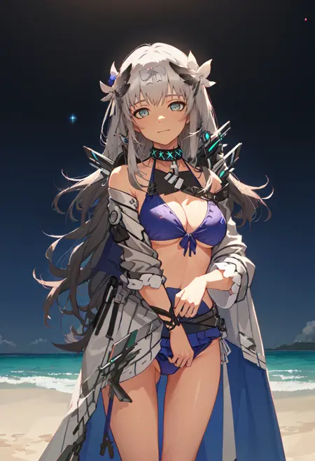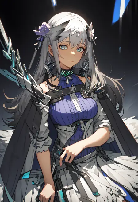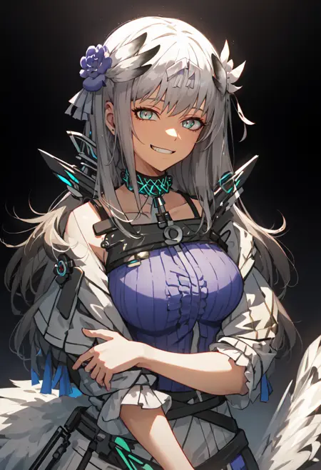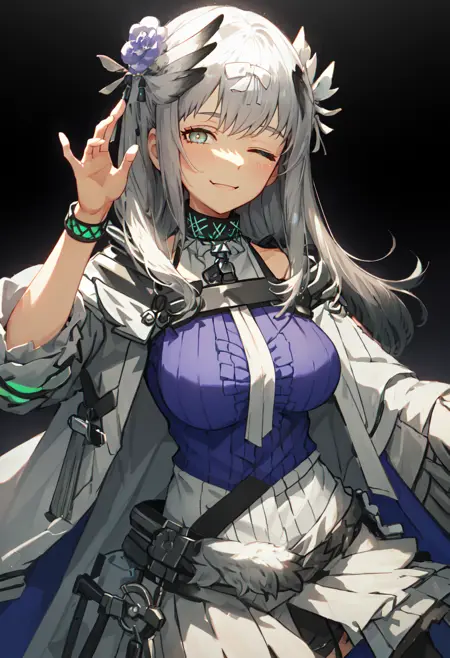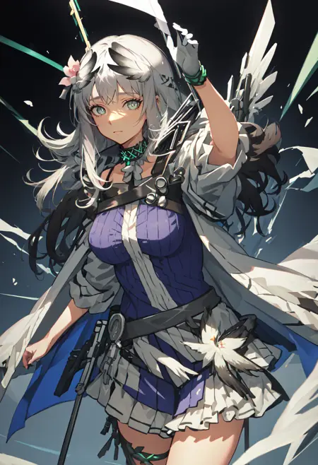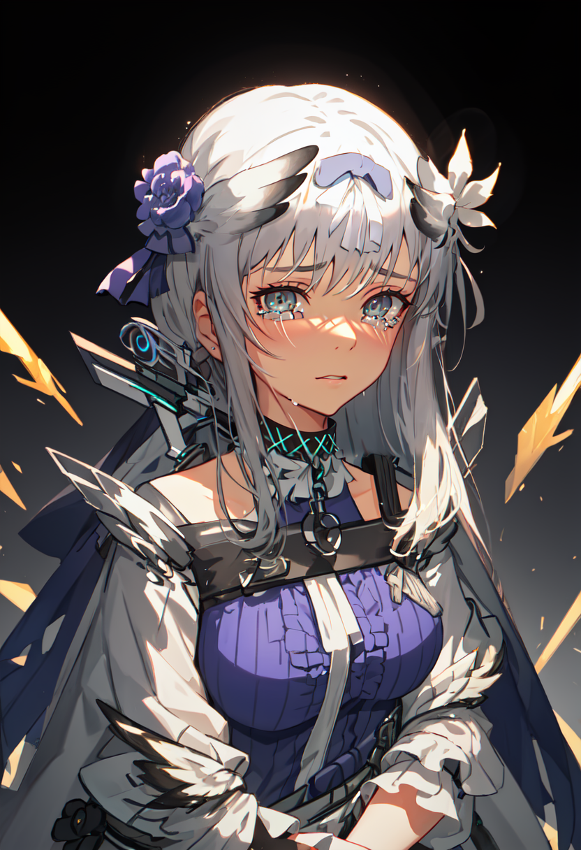 The trigger word is bibeak_arknights, and the pruned tags are long_hair, breasts, hair_ornament, grey_hair, hair_flower, white_hair. When some features (e.g. hair color) are not so stable at some times, you can add these them into your prompt.