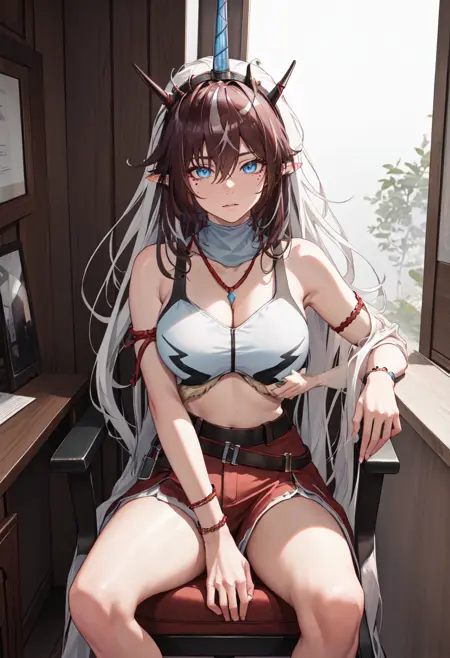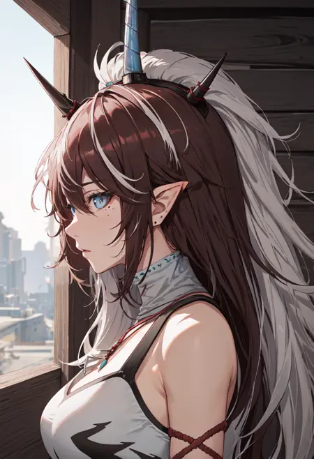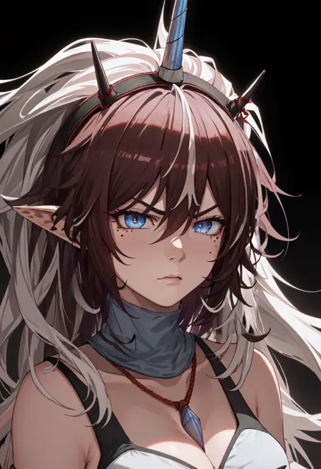触发词为 kirin_r_yato_arknights,已精简的标签为 horns, long_hair, breasts, brown_hair, blue_eyes, multicolored_hair, hair_between_eyes, fake_horns, white_hair, pointy_ears, large_breasts, mole, mole_under_eye, medium_breasts。当某些特征(如发色)在某些时候不够稳定时,您可将这些标签加入提示词中。