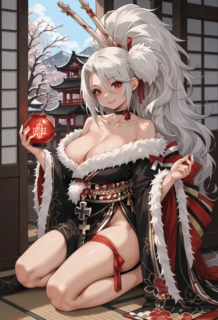 花火とタペストリー(きもの): phkimo、足出し、肩出し、鎖骨、ファー縁取りきもの、髪止め、鉄の十字、日本の衣装、多色きもの、ポニーテール、赤いリボン、帯、広い袖、チョーカー