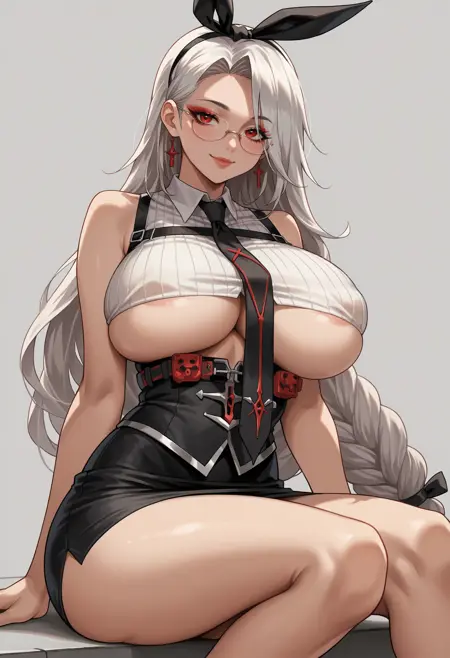 ベース衣装: phog、リブ入りシャツ、ノースリーブシャツ、アンダーブレスト、低く編んだ長い髪、肩出し、黒いネクタイ、髪リボン、踝ブーツ、ハイウエストスカート、赤いトリム、黒いジャケット、白いシャツ