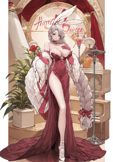 ステージ上(パーティードレス): phjr、肩出し、編み上げポニーテール、カクテルドレス、エルボーグローブ、イブニングドレス、フェザーボア、ハイヒール、ロングドレス、赤いドレス、サイドスリット、ストラップレスドレス