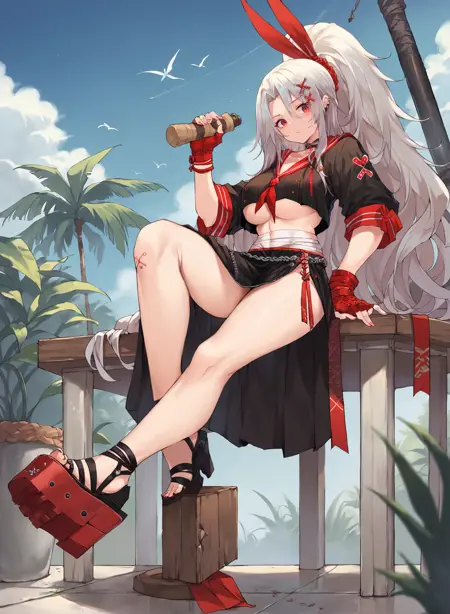 地下世界の秘密のボス?(不良): phsuke、足出し、黒いセラフク、ショートトップのハングオーバー、フィンガーレスグローブ、高いポニーテール、お腹出し、プラットフォームヒール、赤いグローブ、フィンガーレスグローブ、セーラー collar、ブラなし、X型の髪飾り、晒し、ロングスカート