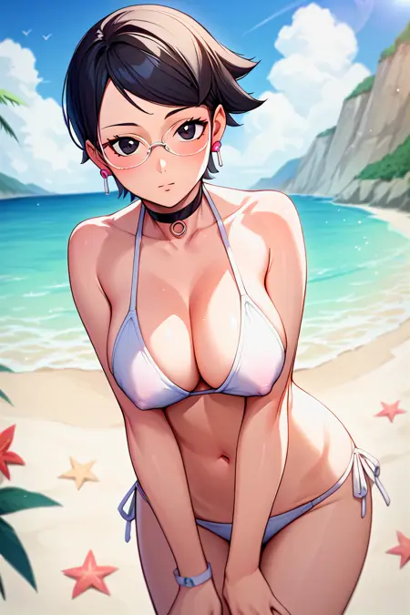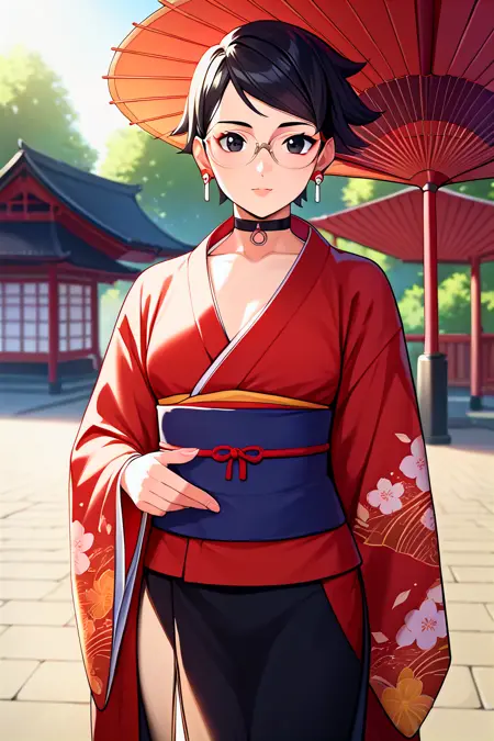 Trigger Words: ``sarada, black hair, red eyes, short hair, swept bangs, choker, glasses, earrings``