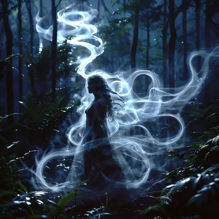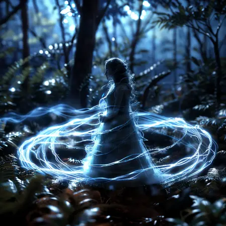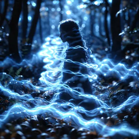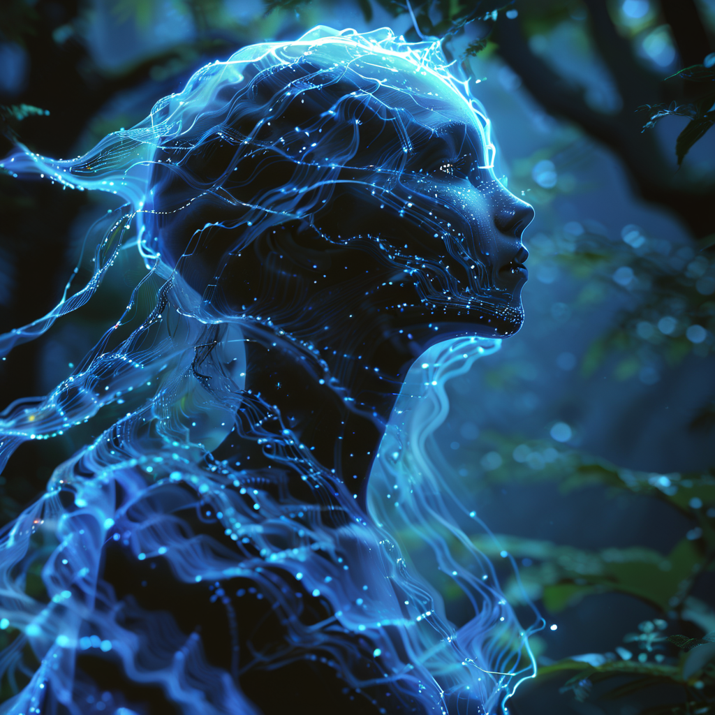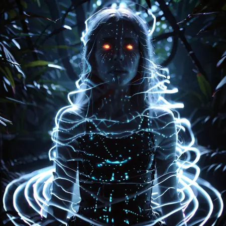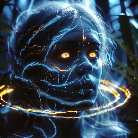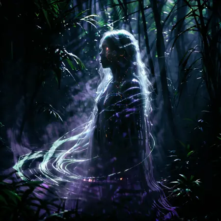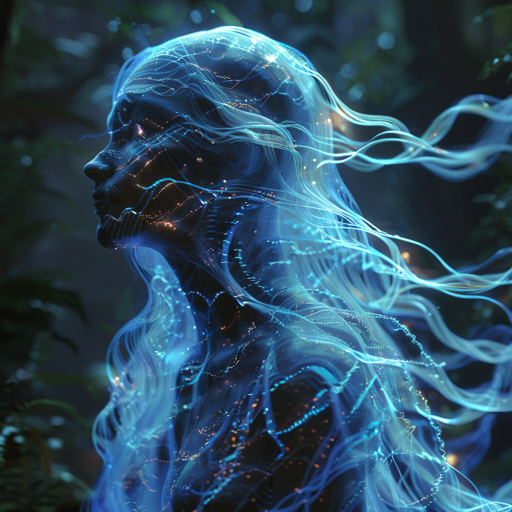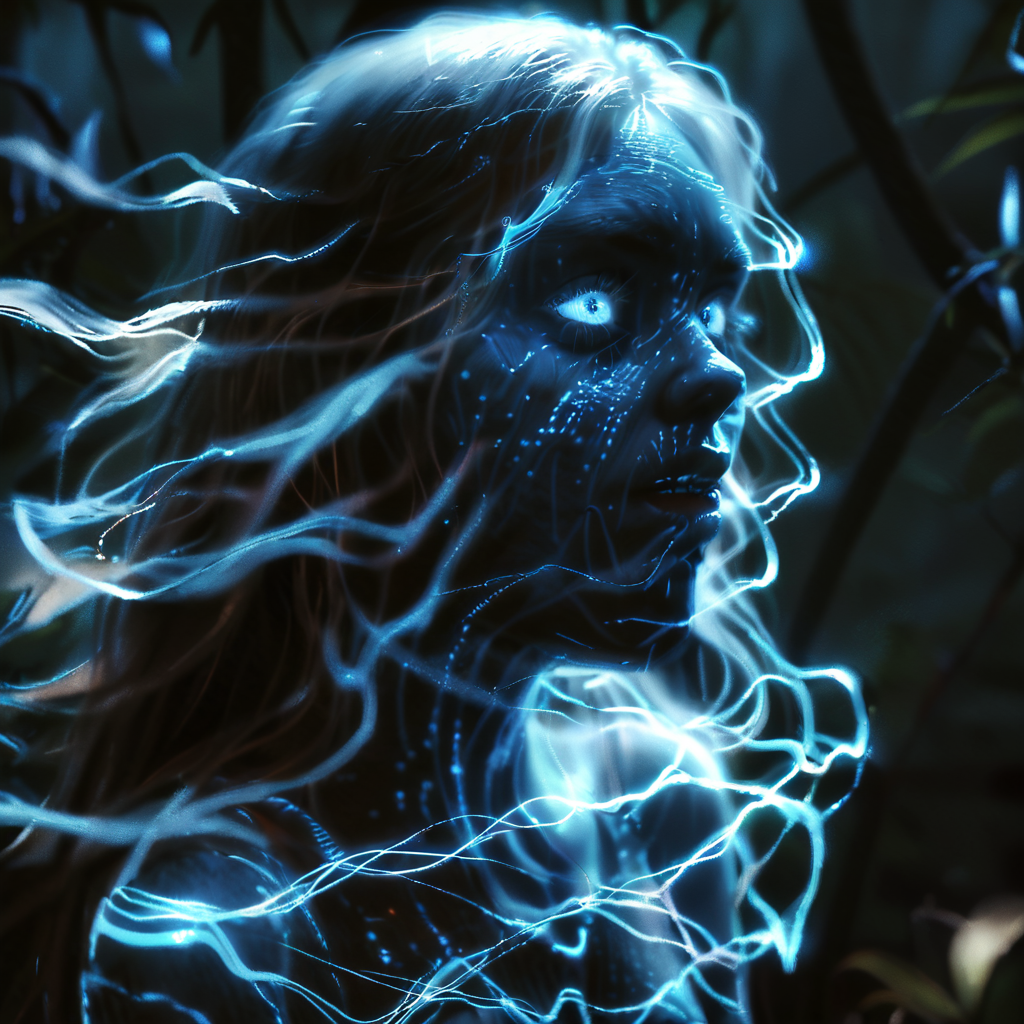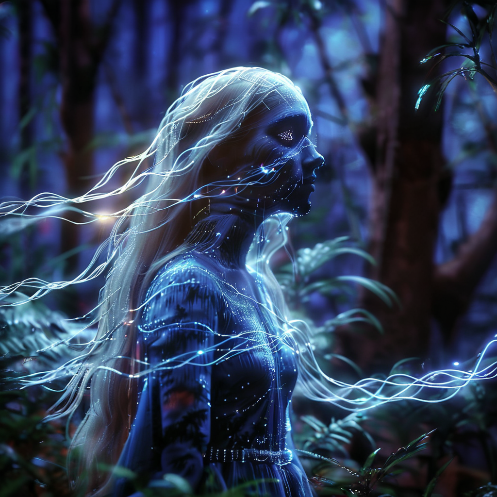 1girl, absurdly long hair, bare shoulders, barefoot, blue eyes, blue skin, blue theme, blurry, blurry background, braid, breasts, closed eyes, closed mouth, colored skin, dark, depth of field, dress, floating hair, from behind, from side, glowing, glowing eyes, lips, long hair, looking at viewer, looking up, navel, nipples, no humans, nude, ponytail, portrait, profile, ripples, see-through, silhouette, solo, sound waves, sound-of-anzhu, standing, transparent, tree, upper body, very long hair, walking, yellow eyes,