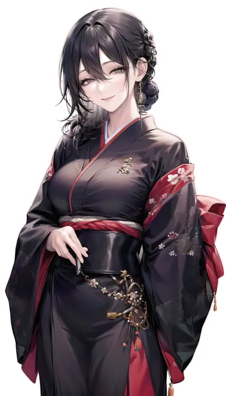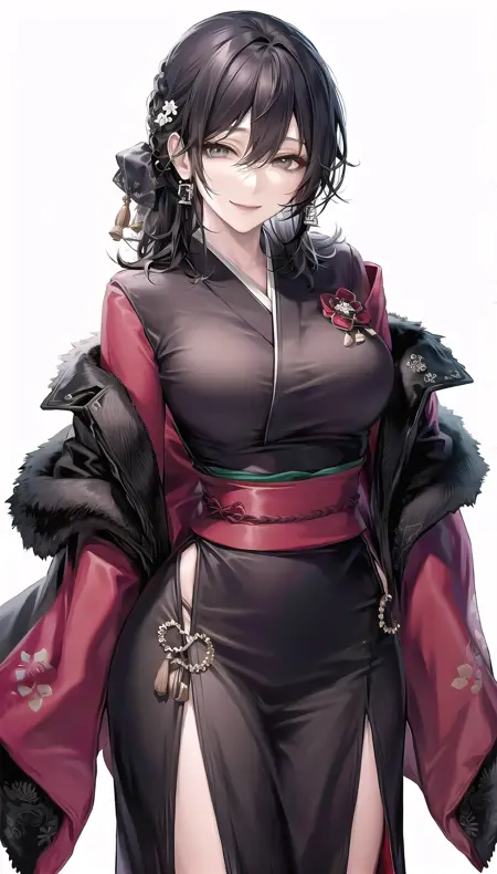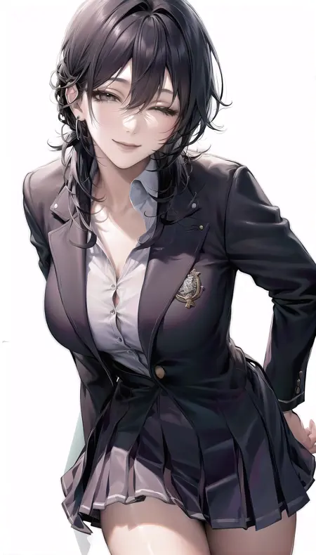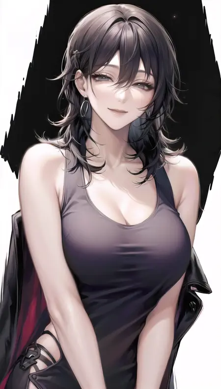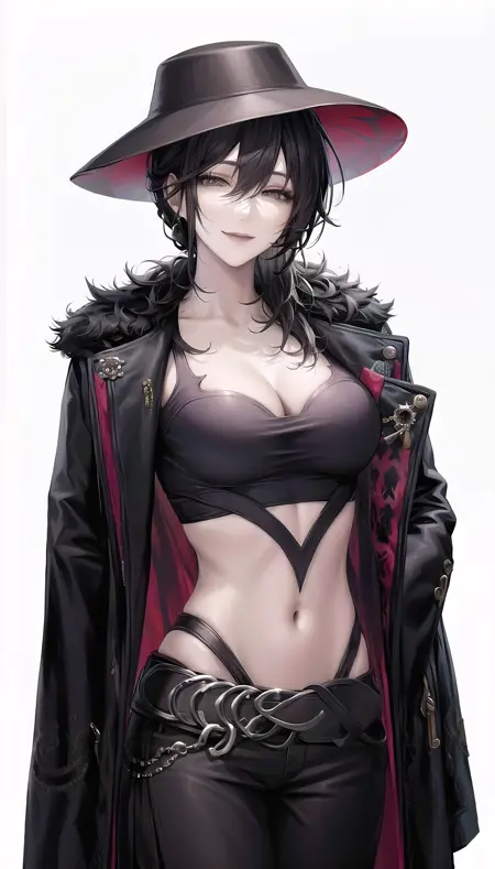Outfits 1:deren-hairstyle, light smile,half-closed eyes,hat, black pants, bandeau, black coat,navel,