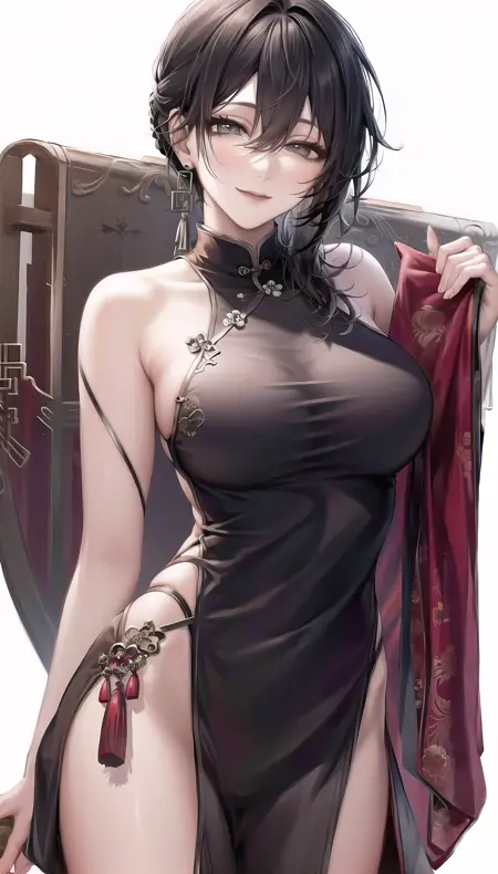 Outfits 2:hair over shoulder-hairstyle, light smile,strapless dress,