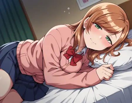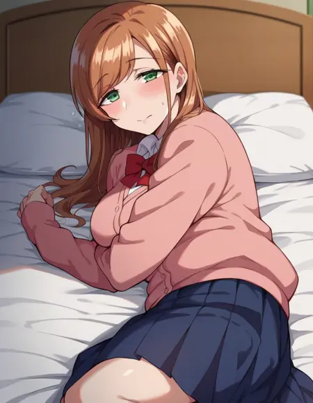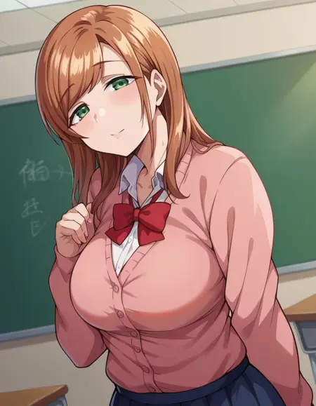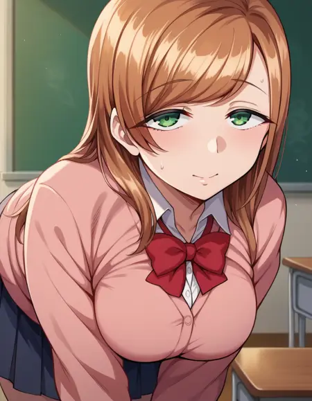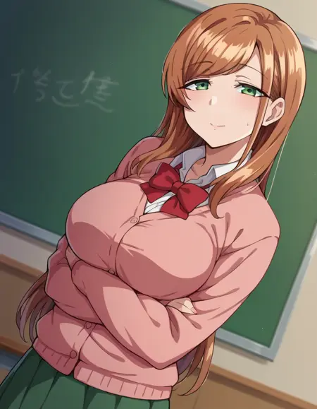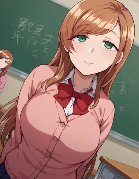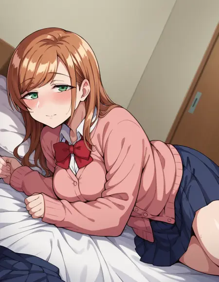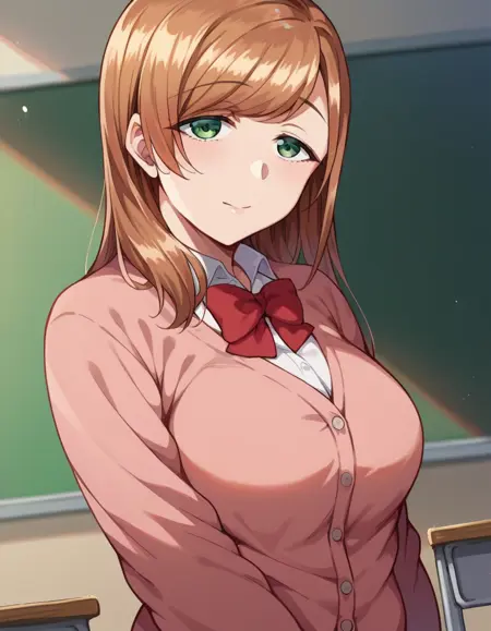 long sleeves, bow, school uniform, bowtie, red bow, cardigan, pink cardigan,