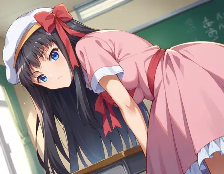 모자, 드레스, 분홍 드레스, 리본, 빨간 리본, 짧은 소매,