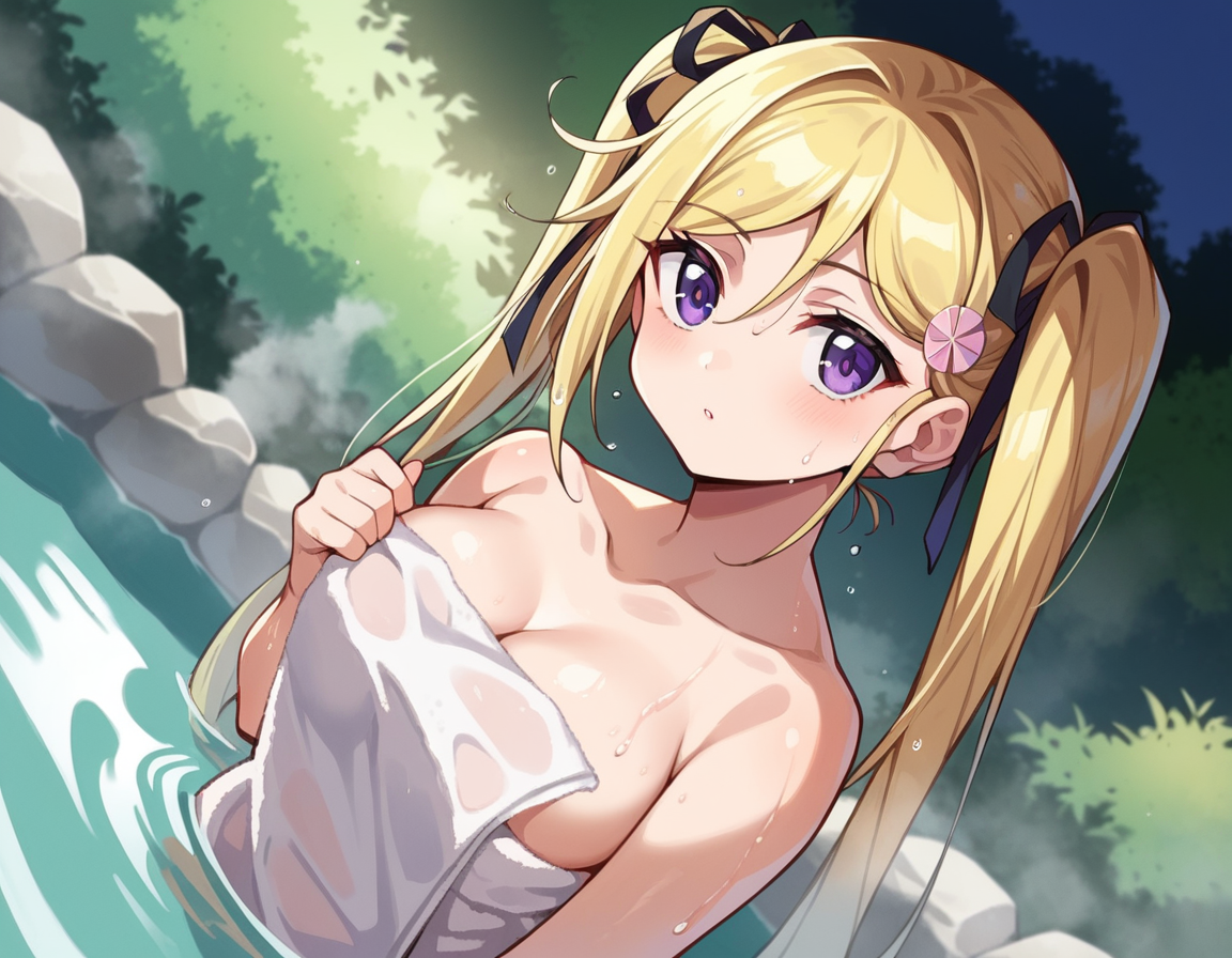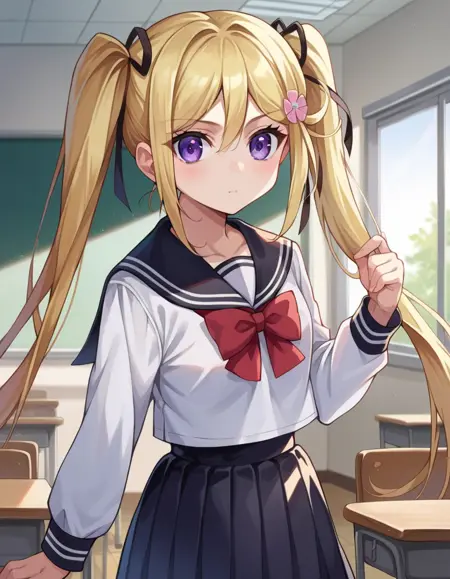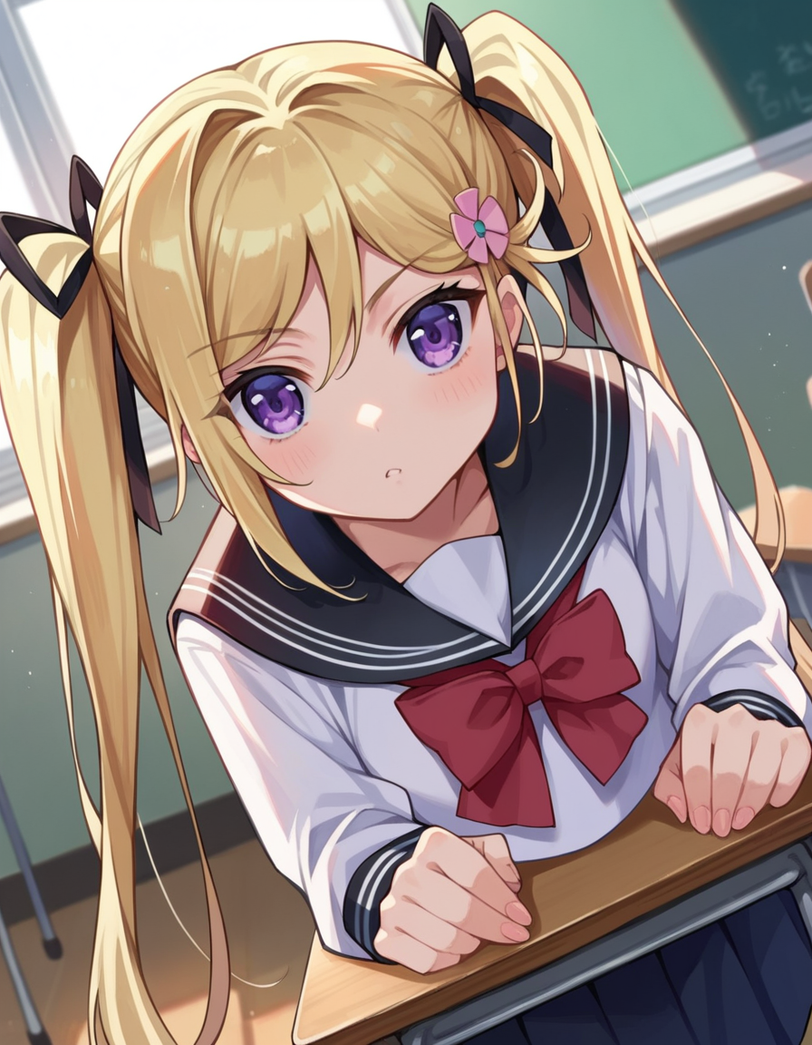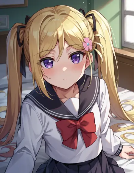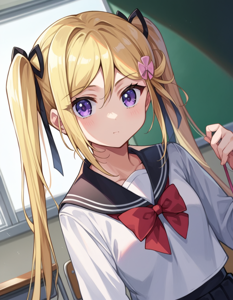 mafuyu orifushi, long hair, blonde hair, hair ornament, ribbon, twintails, purple eyes, hair ribbon,