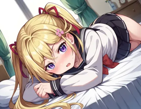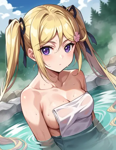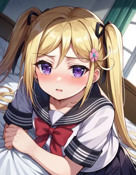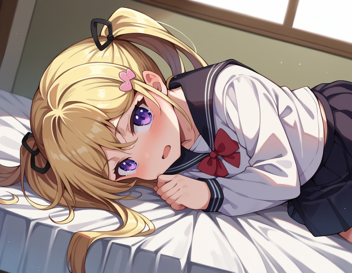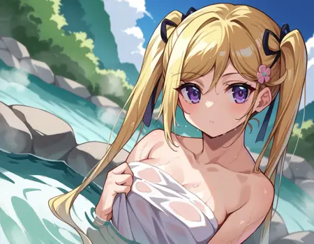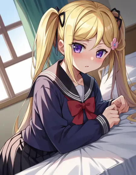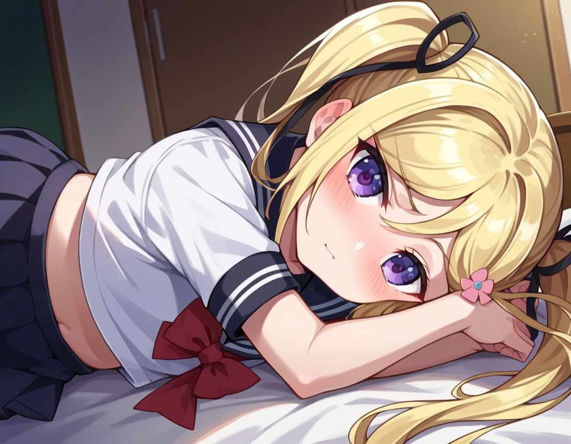 mafuyu orifushi, long hair, blonde hair, hair ornament, ribbon, twintails, purple eyes, hair ribbon,