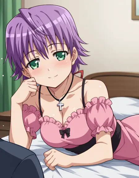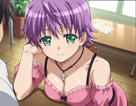 bare shoulders, necklace, cross, dress, pink dress, cleavage,