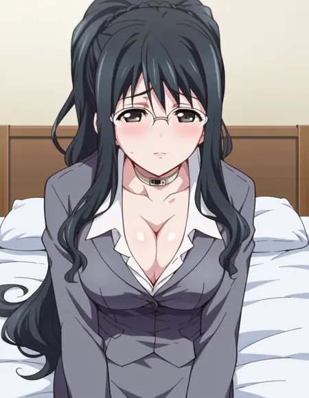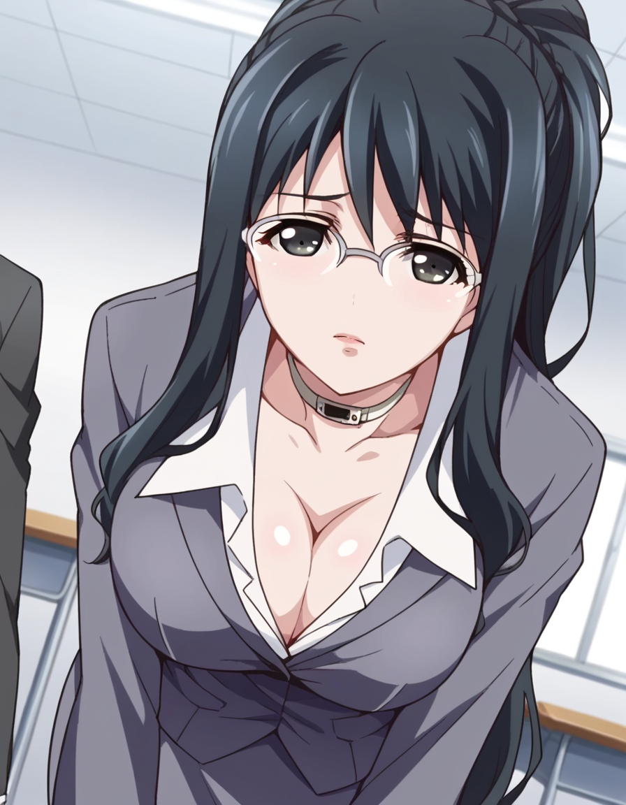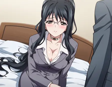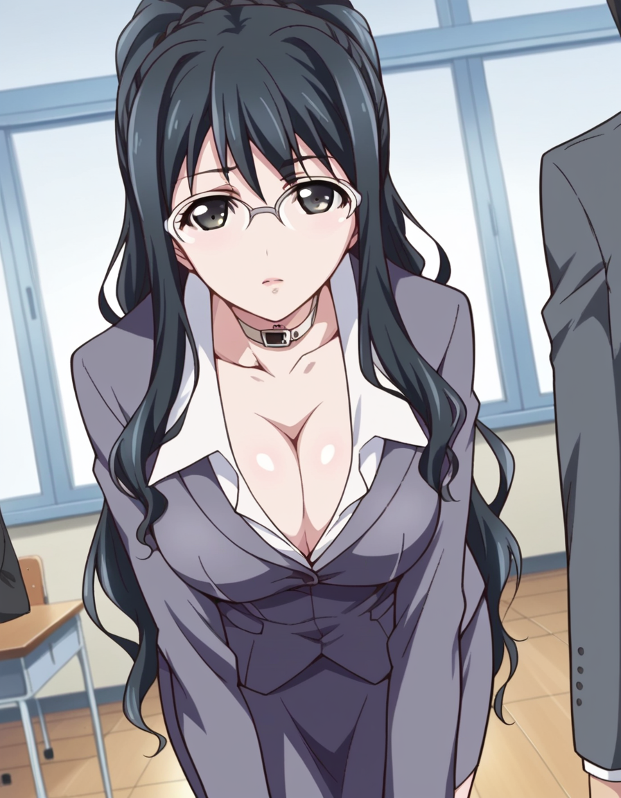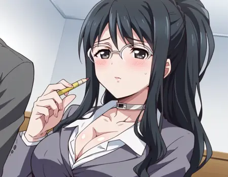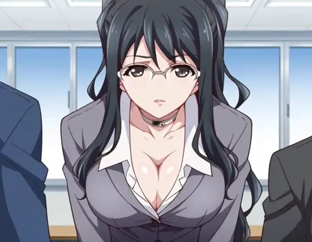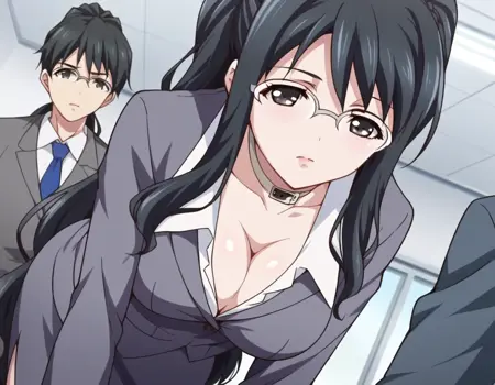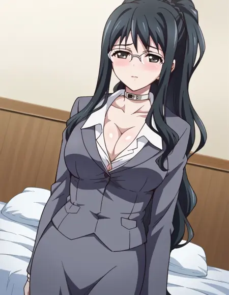 cleavage, choker, collar, formal, suit, skirt, pencil skirt,