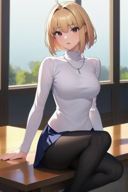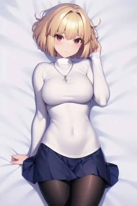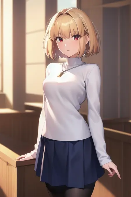1girl, solo, arcueid, blonde hair, short hair, red eyes, sweater, white sweater, necklace, pleated skirt, blue skirt, leggings, (black leggings:1.2), boots, brown boots, <lora:Arcueid_Brunestud__Tsukihime:1>