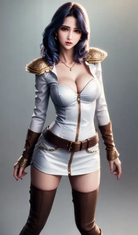 armor, shoulder pads, leather, white leather bodysuit, miniskirt, white miniskirt, long sleeves, thigh boots, brown thigh boots, brown belt,