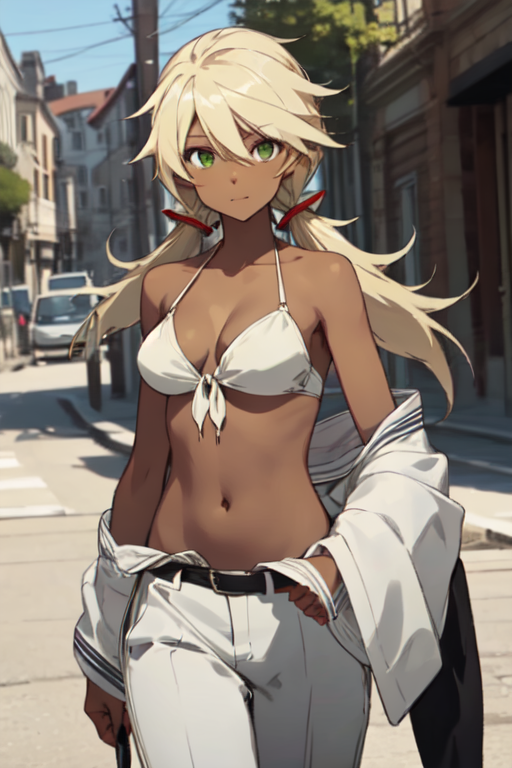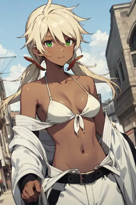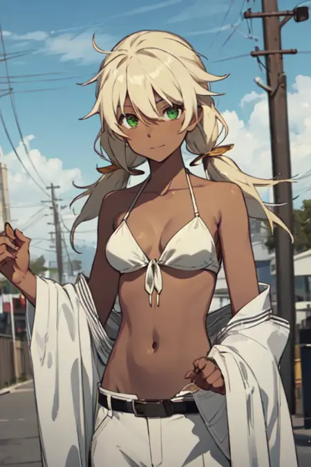 MezAGK, 1girl, solo, long hair, blonde hair, navel, twintails, medium breasts, bikini top only, dark skin, dark-skinned female, white bikini, green eyes, off shoulder, front-tie top, white pants,