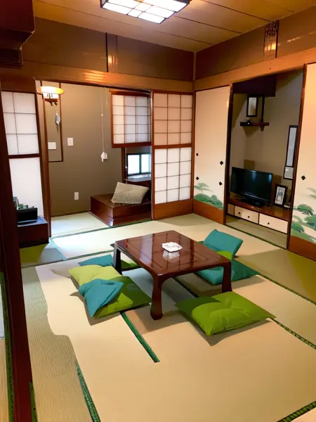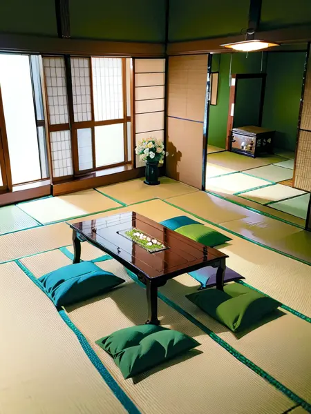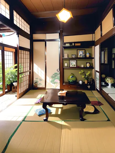 washitsu, scenery, table, plant, indoors, lamp, sliding doors, tatami, tree, box, book, window, chair, potted plant, vase, television, architecture,