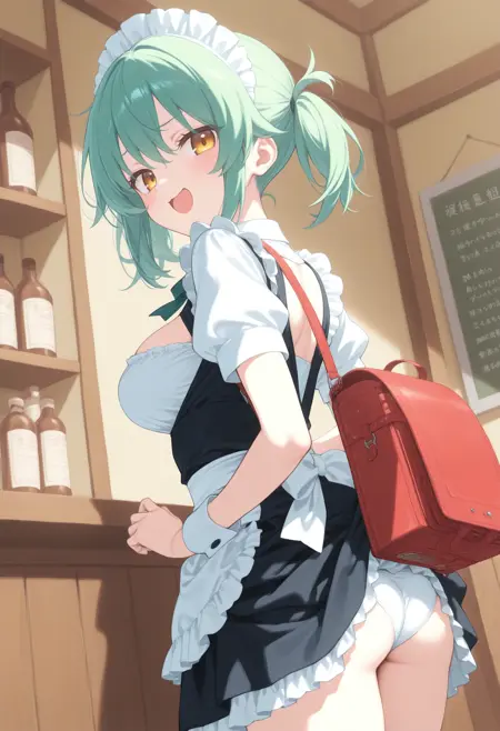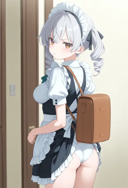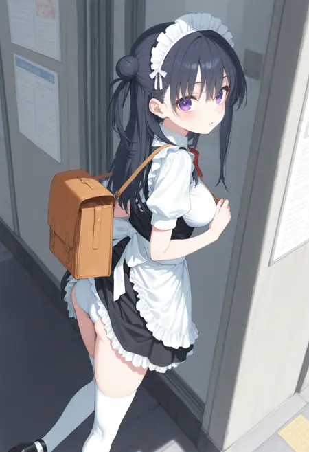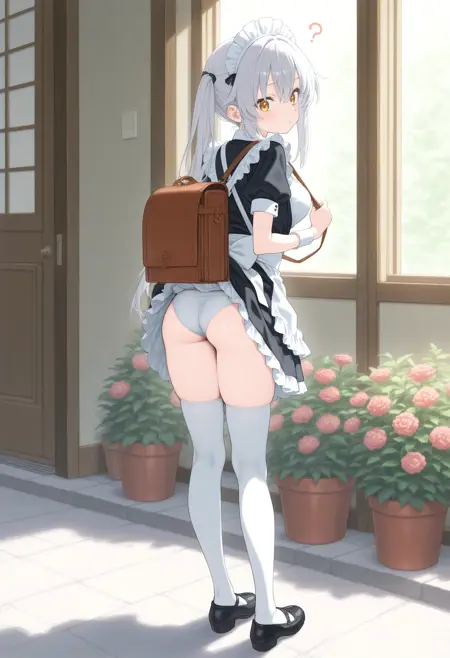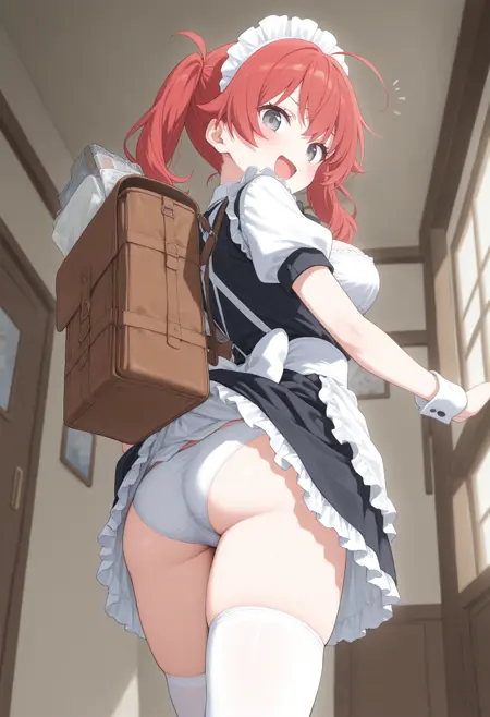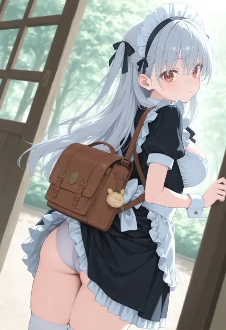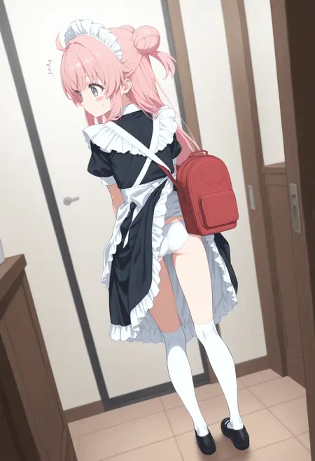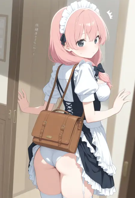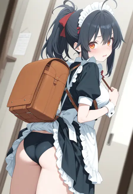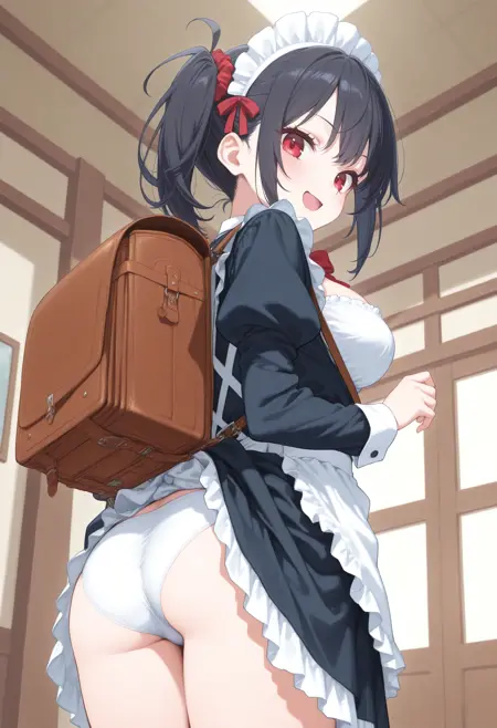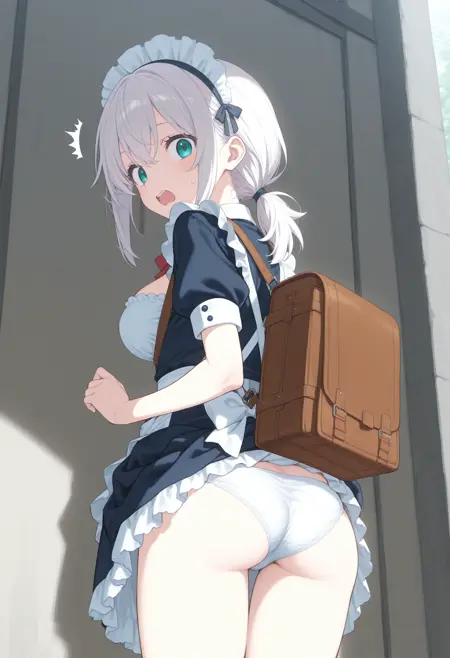 パンツが見えないように背中にバッグを背負っているのに、そのバッグでスカートが捲れてしまっているLoRAです。
