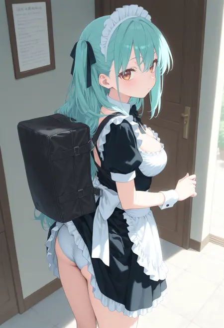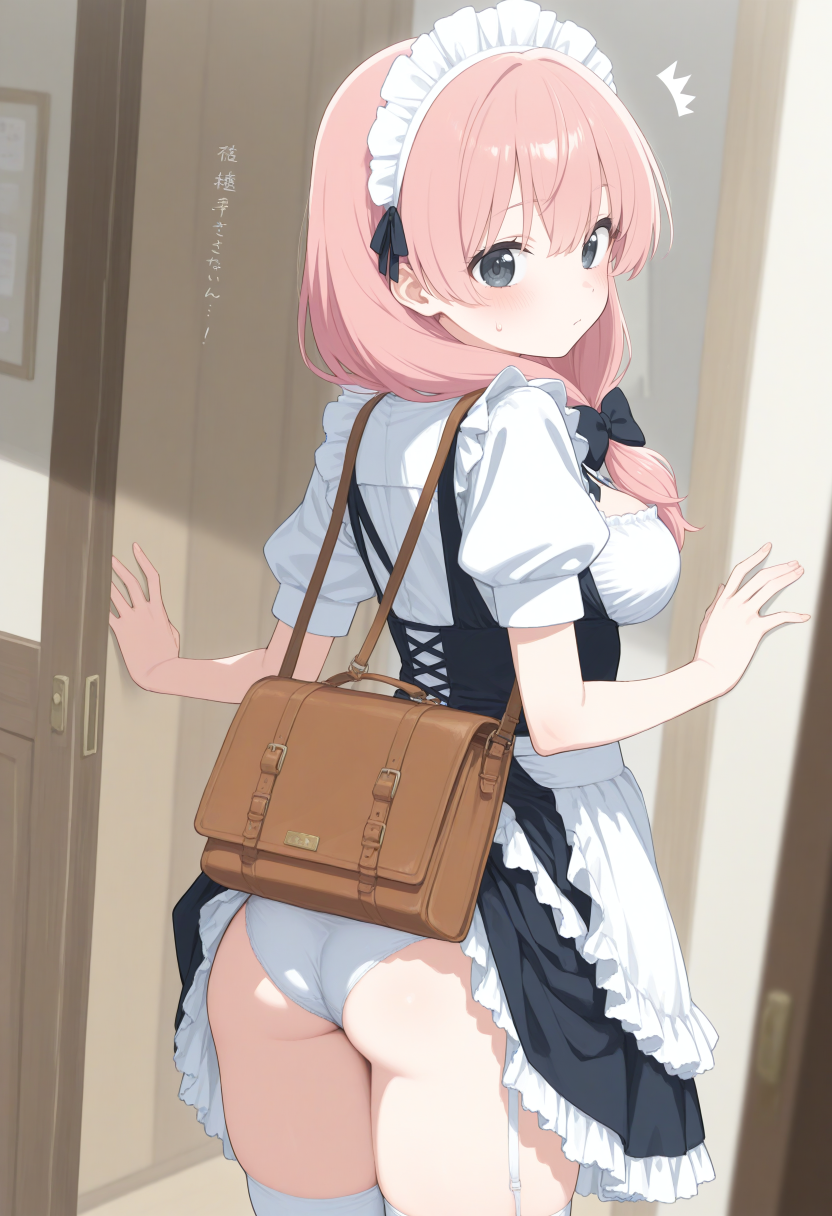 パンツが見えないように背中にバッグを背負っているのにそのバッグでスカートが捲れてしまっているLoRAです。