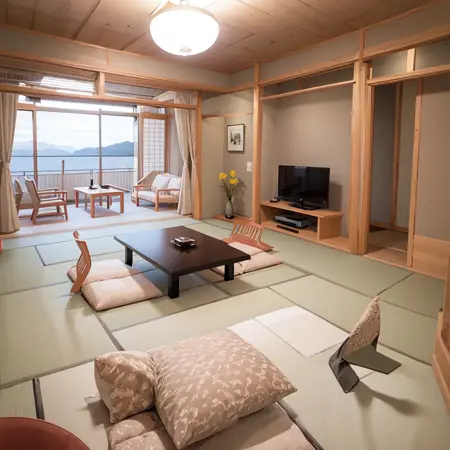 일본의 전통 숙소나 호텔은 종종 히로엔을 갖추고 있으며, 리요칸은 손님들이 창밖의 풍경을 감상하며 편안하게 쉴 수 있도록 테이블과 의자로 구비되어 있습니다.