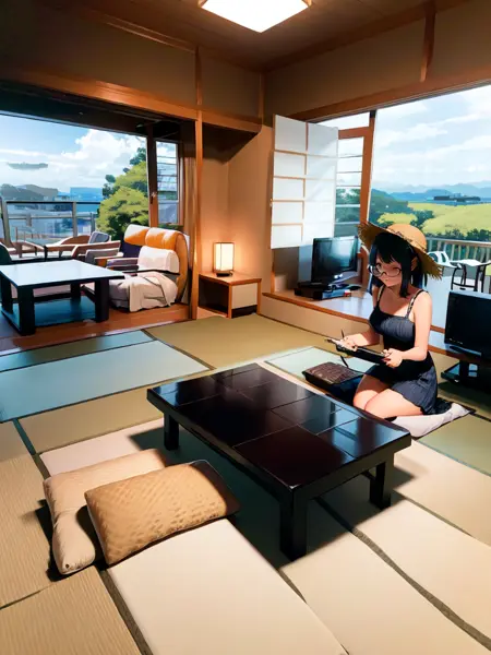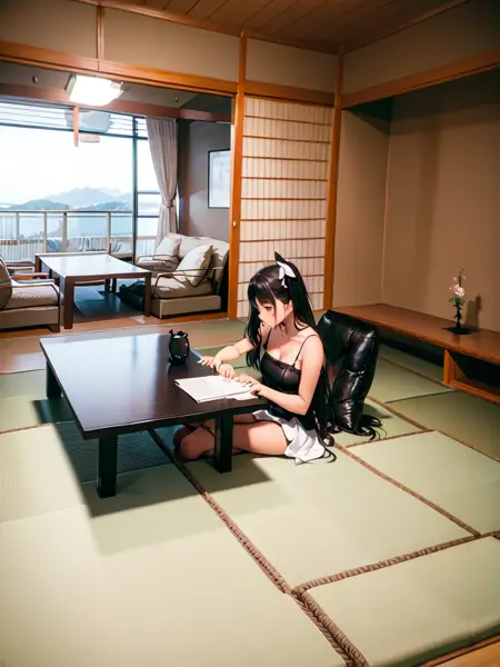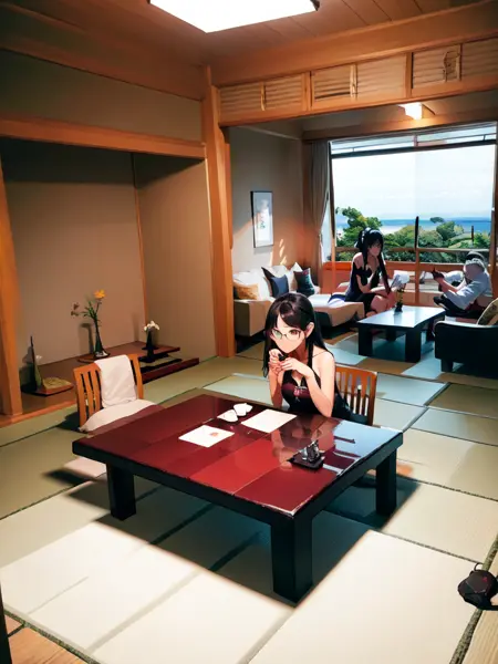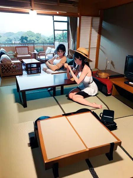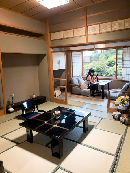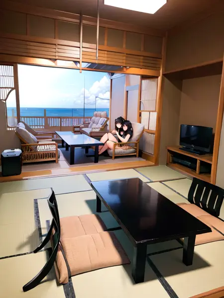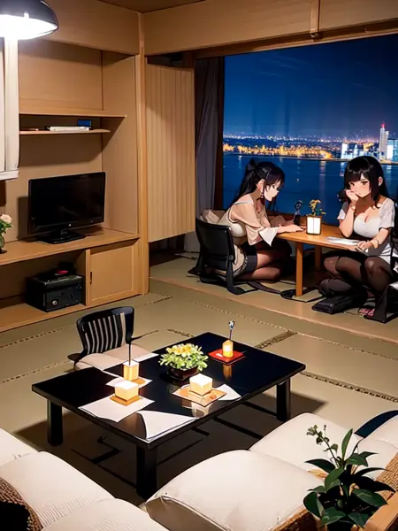 ryokan, scenery, table, indoors, television, window, chair, cup, ceiling light, lamp, flower pot, sunlight,