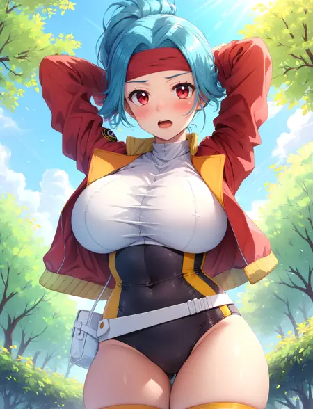 재킷, 허벅지, 벨트, 레오타드, 헤드밴드, 두꺼운 허벅지, 빨간 재킷, 짧은 재킷, 빨간 헤드밴드, solana \(pokemon\)
