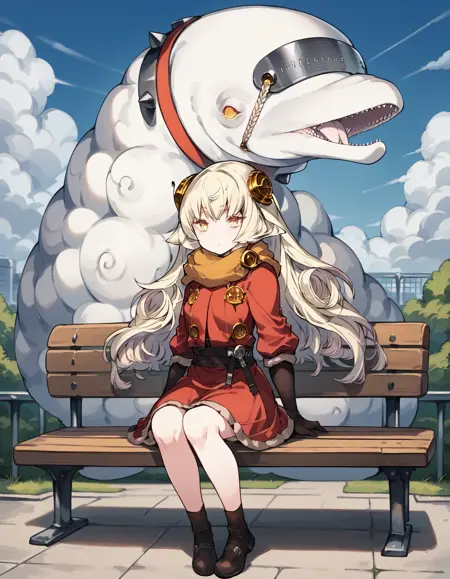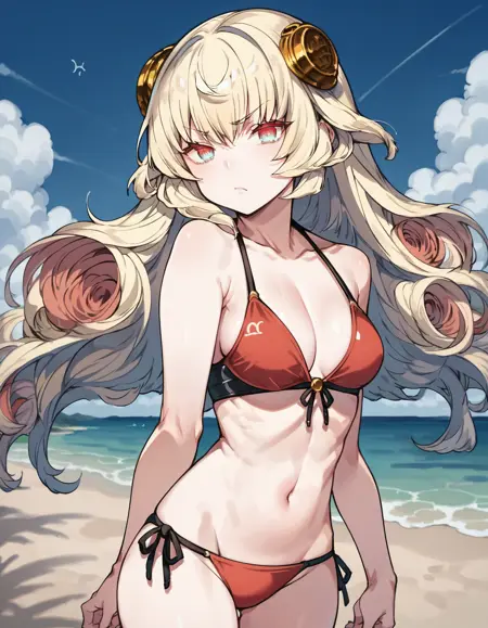 Her appearance is generally covered by the activation tag, though you can play around with red eyes, blue eyes to get her eyes accurately, it still behaved inconsistently for me (unfortunate consequence of the limited dataset).